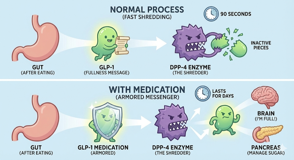 The problem is that natural GLP-1 is extremely short-lived. An enzyme called DPP-4 acts as a hyper-efficient biological shredder, destroying the fullness signal in approximately 90 seconds (Nauck & Quast, 2021). Evolution designed this to keep you eating in environments where food was scarce. Useful for a caveman; less helpful when you are walking past a fresh Butterzopf display at the train station.